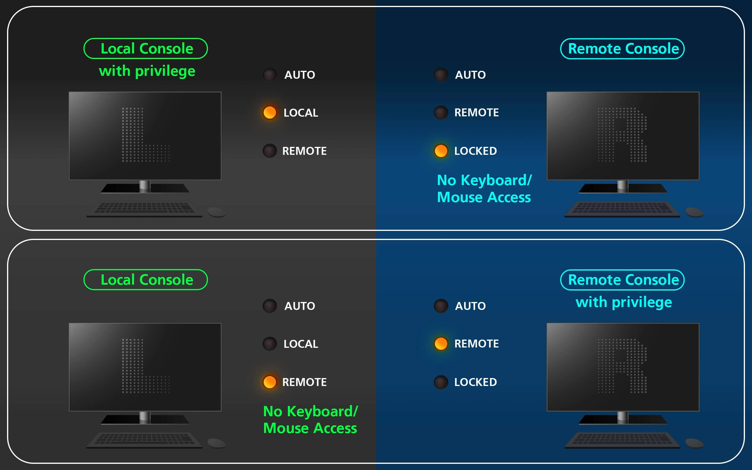 CE980 ช่วยให้คุณเข้าถึงและควบคุมคอมพิวเตอร์ได้จากทั้งเครื่องควบคุมฝั่งต้นทาง (local console) และปลายทาง (remote console) ทำให้การทำงานร่วมกันเป็นไปอย่างมีประสิทธิภาพมากขึ้น