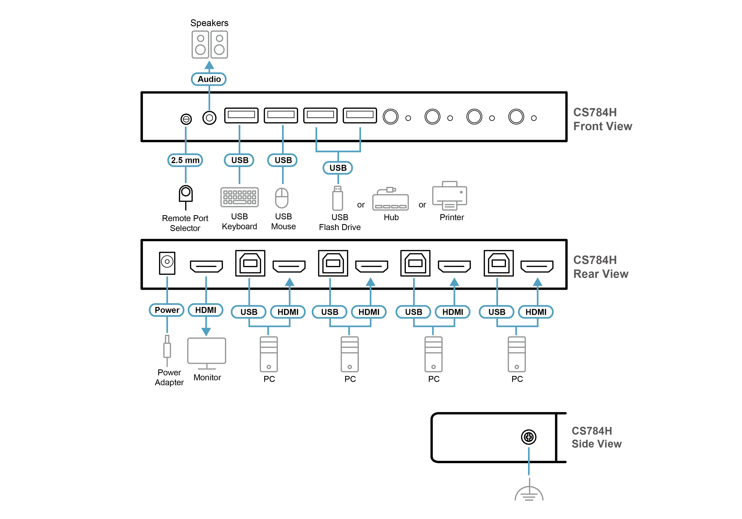 CS784H คือ KVM สวิตช์แบบตั้งโต๊ะ 4 พอร์ต ที่ออกแบบมาสำหรับผู้ที่ต้องการเวิร์กโฟลว์ที่คล่องตัวและคุณภาพของภาพที่ยอดเยี่ยมจากคอมพิวเตอร์หลายเครื่อง ช่วยให้สามารถสลับใช้งานระหว่างคอมพิวเตอร์ HDMI สี่เครื่องได้อย่างรวดเร็วและเชื่อถือได้ ด้วยความละเอียดสูงสุดถึง 4K DCI ในขณะที่ใช้คีย์บอร์ด จอภาพ เมาส์ ช่องสัญญาณเสียง และอุปกรณ์ต่อพ่วง USB ร่วมกันผ่าน KVM คอนโซลเดียว ด้วยวิธีการสลับที่หลากหลาย ไม่ว่าจะเป็นปุ่มกด, ปุ่มคีย์ลัด (hotkeys) และ Remote port selector (ปุ่มกด) ทำให้ CS784H เป็นอุปกรณ์ที่สมบูรณ์แบบสำหรับโต๊ะทำงานในสำนักงาน, การสร้างสรรค์คอนเทนต์, งานออกแบบ และอื่น ๆ อีกมากมาย