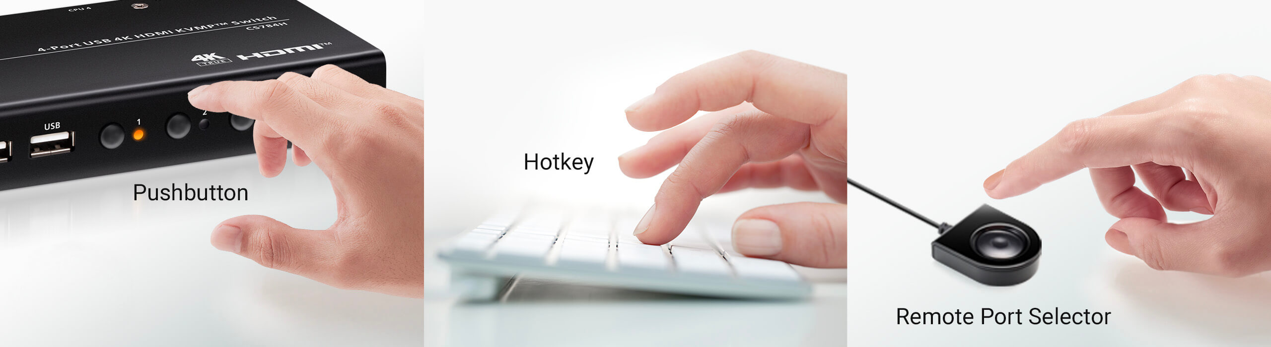 การสลับพอร์ตทำได้อย่างรวดเร็วและยืดหยุ่นผ่านปุ่มกด, ปุ่มคีย์ลัด (hotkeys) หรือ Remote port selector (ปุ่มกด) ซึ่งสามารถเลือกใช้ได้ตามความถนัดของคุณ