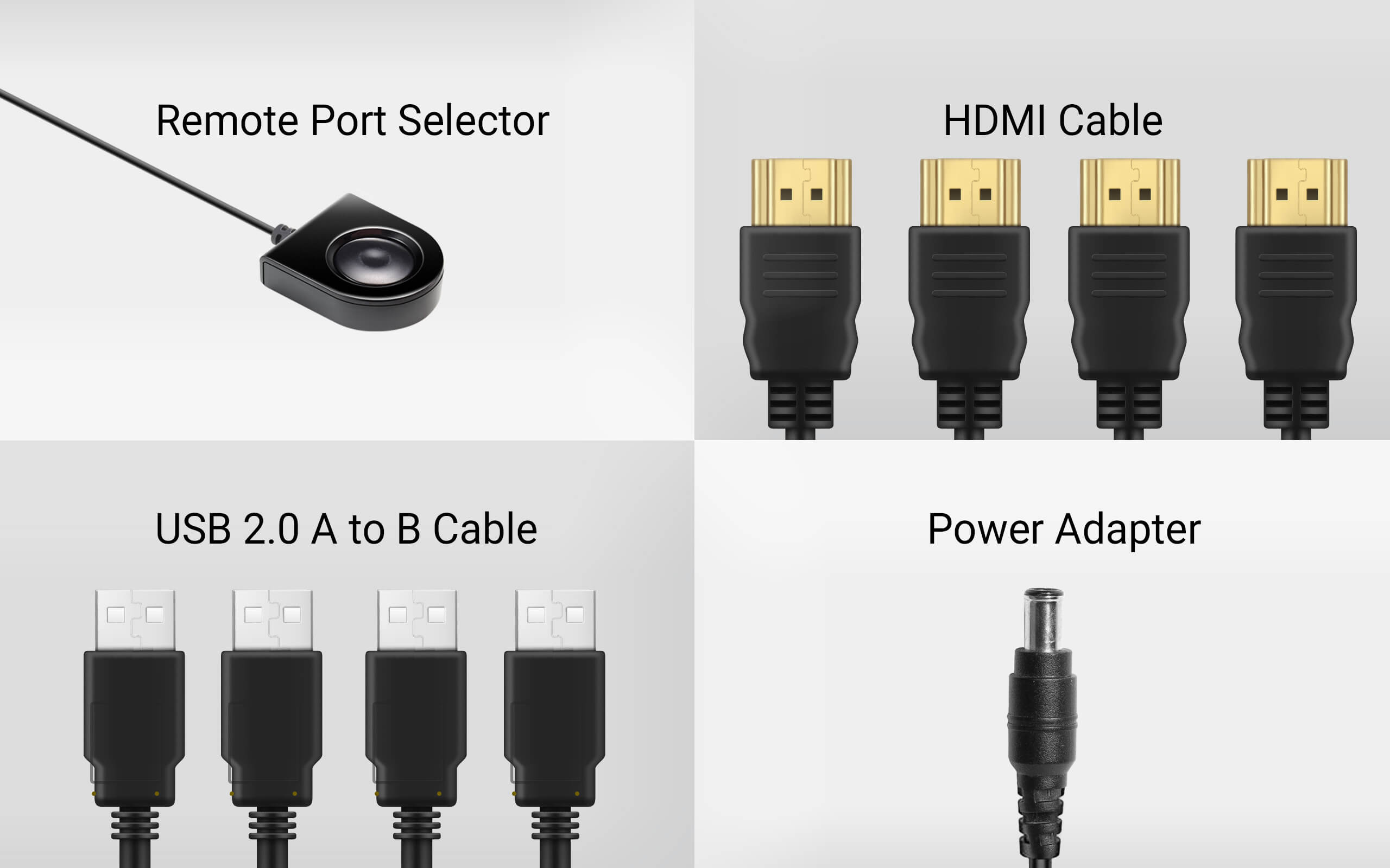 มีอุปกรณ์ที่จำเป็นทั้งหมดให้ในชุดเพื่อการติดตั้งที่รวดเร็ว ได้แก่ สาย HDMI 4 เส้น, สาย USB 2.0 A to B 2 เส้น, อะแดปเตอร์แปลงไฟ 1 ตัว และRemote port selector (ปุ่มสวิตช์แบบมีสาย) 1 ตัว