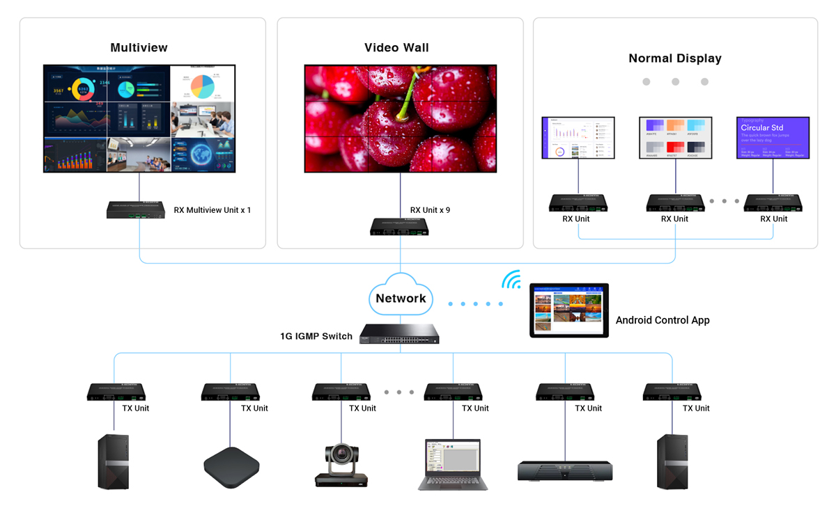 อุปกรณ์นี้ออกแบบมาสำหรับ HDMI Over IP system โดยต้องใช้งานร่วมกับผลิตภัณฑ์ใน Series เดียวกัน เช่น NL4120PT (TX Unit) ผ่าน Network Switch ที่รองรับ IGMP อุปกรณ์นี้สามารถรับและประมวลผลสัญญาณ AV ได้หลายช่องทางพร้อมกัน ทำให้สามารถ ควบคุมการแสดงผลวิดีโอ 4K@60Hz หลายภาพจากระยะไกลผ่าน Android App สำหรับควบคุม