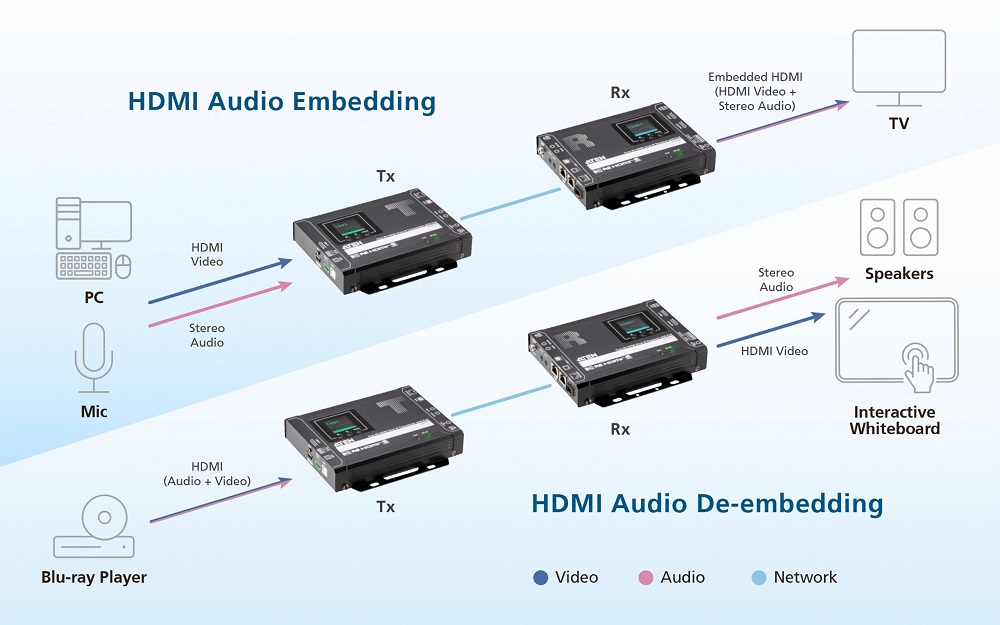 ด้วยการรวมสัญญาณเสียงเข้าไปในสัญญาณ HDMI โดยตรง ทำให้สามารถรวมภาพและเสียงไว้ในสาย HDMI เพียงเส้นเดียว ลดความซับซ้อนในการเชื่อมต่อได้อย่างมีประสิทธิภาพ อีกทั้งยังสามารถแยกสัญญาณเสียงออกจากวิดีโอ (De-Embedding) ได้เมื่อต้องการ เพื่อให้รองรับการทำงานร่วมกับระบบเสียงหลากหลายรูปแบบ