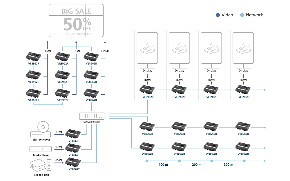 โครงสร้างพื้นฐาน AV แบบเครือข่าย สามารถขยายได้ด้วยการเชื่อมต่อแบบ Daisy-Chain Receiver สูงสุดถึง 30 เครื่อง เพื่อรับสัญญาณวิดีโอจากต้นทางเดียวกัน ทำให้กระจายคอนเทนต์ได้อย่างยืดหยุ่นบนเครือข่ายที่มีอยู่ โดยลดความจำเป็นในการเพิ่มสวิตช์เครือข่ายเพิ่มเติม พร้อมเพิ่มประสิทธิภาพในด้านต้นทุน เวลา และการใช้พื้นที่