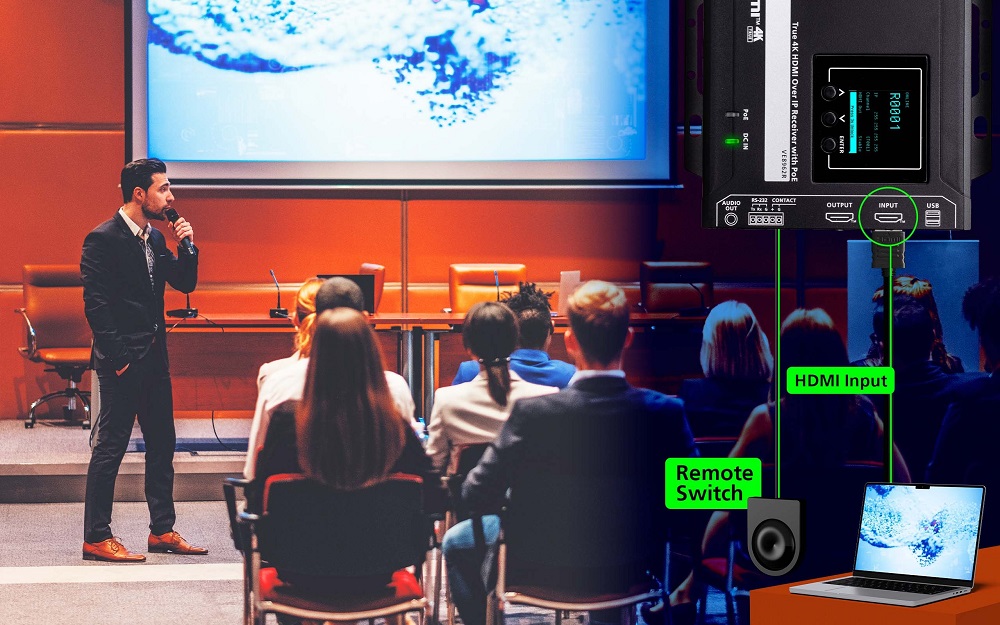 เมื่อต้องการอัปเดตคอนเทนต์อย่างทันท่วงที VE8962 มีพอร์ต HDMI Input ที่รองรับการเชื่อมต่ออุปกรณ์ต้นทางแบบ Plug-and-Play เพื่อใช้งานได้ทันทีที่จุดรับสัญญาณ (Receiver) อีกทั้งยังสามารถสลับระหว่างสัญญาณจากแหล่งภายในและแหล่งสัญญาณระยะไกลได้อย่างสะดวก ผ่านสวิตช์รีโมตที่เชื่อมต่อกับพอร์ต Contact