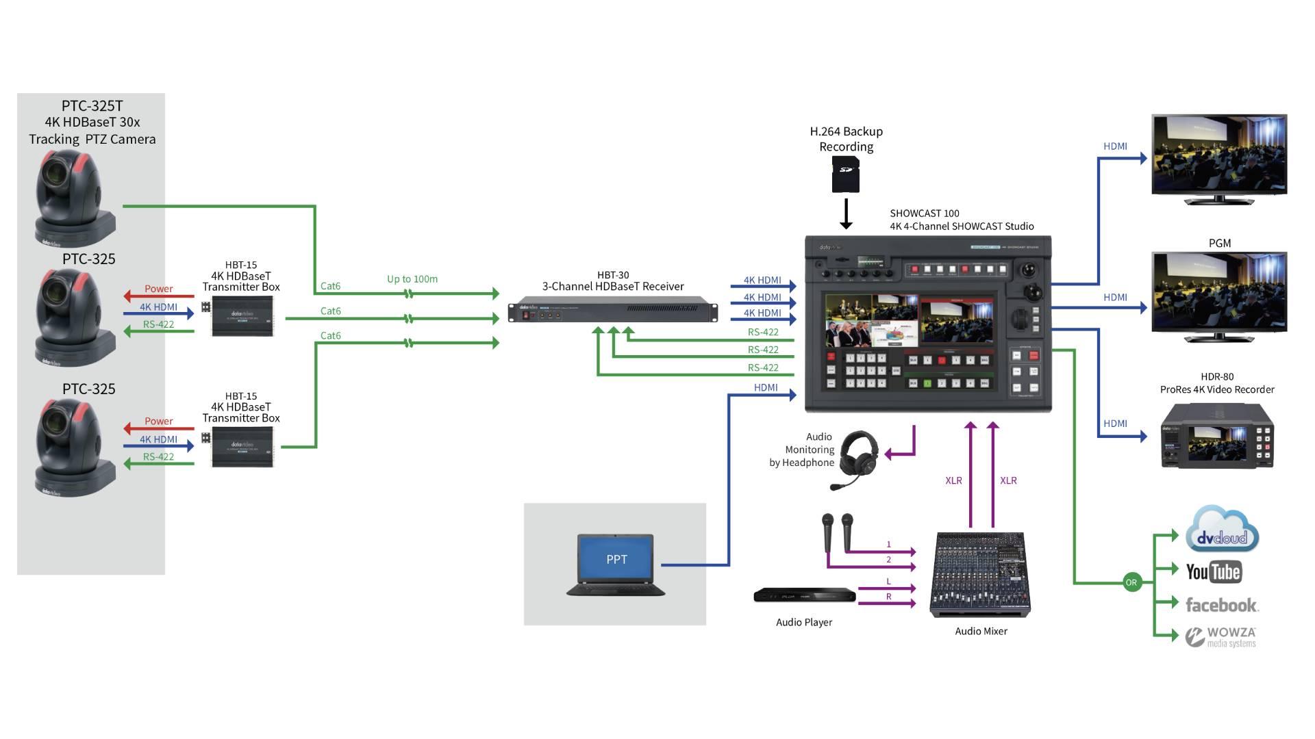 เมื่อใช้ตัวเข้ารหัส Datavideo และ dvCloud ร่วมกัน คุณจะสามารถใช้ SRT (แทน RTMP) ในการเชื่อมต่อเริ่มต้นที่มีปัญหาได้ หลังจากสตรีมวิดีโอของคุณไปถึง dvCloud คุณสามารถพึ่งพาเครือข่ายแบนด์วิธสูงที่เชื่อถือได้ของ dvCloud เพื่อส่งมอบสตรีมไปยังปลายทางที่คุณชื่นชอบ เช่น Facebook และ YouTube