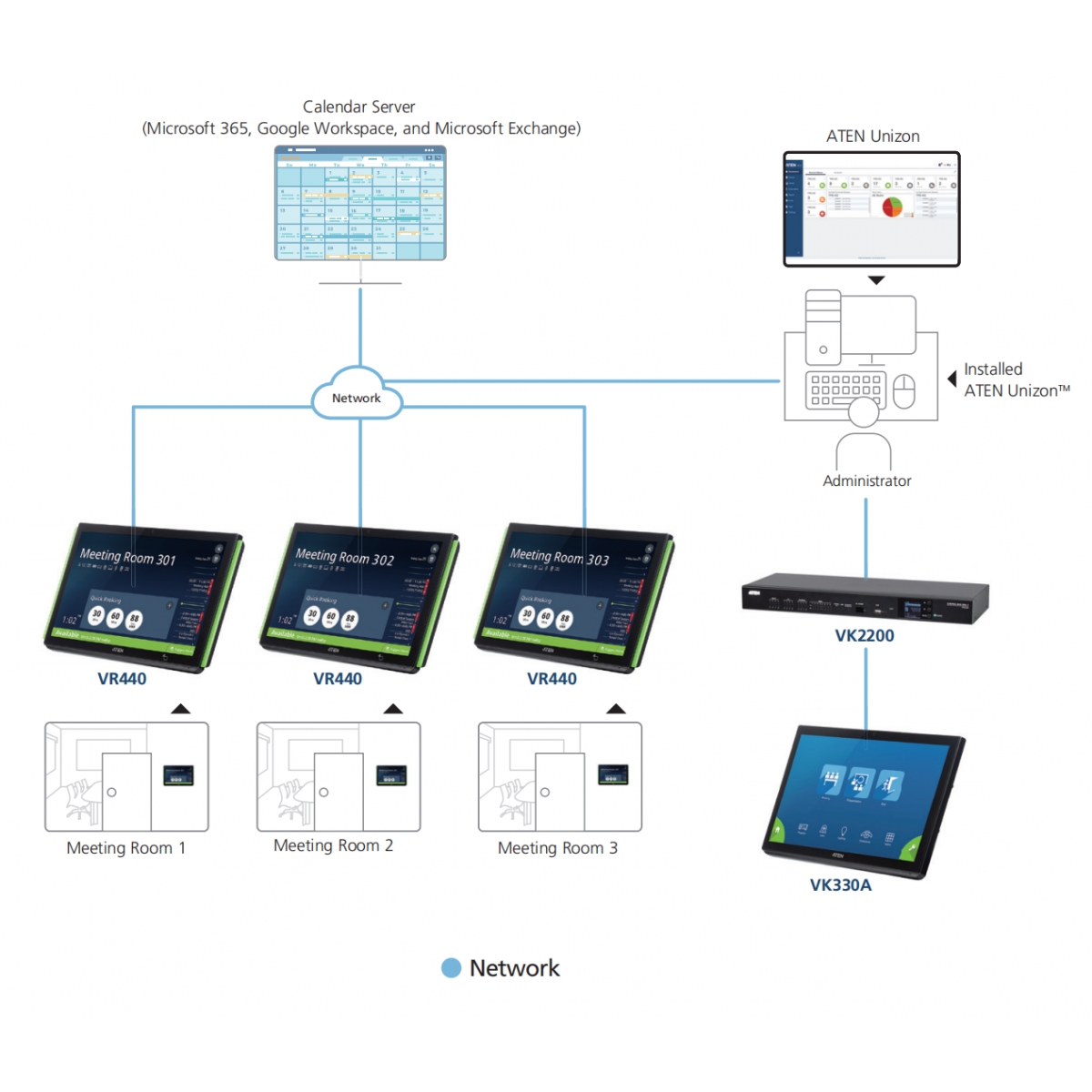 เมื่อใช้งานร่วมกับ ATEN Unizon และระบบ ATEN Room Booking ผู้ดูแลสามารถตรวจสอบสถานะการใช้งานห้องประชุมได้แบบเรียลไทม์ พร้อมรองรับการจองห้องผ่าน ระบบจองห้องประชุมอัจฉริยะ และเมื่อทำงานร่วมกับ VK401 ยังสามารถเพิ่มความปลอดภัยด้วยระบบ Card Access ให้เฉพาะผู้มีสิทธิ์เข้าใช้งาน ช่วยยกระดับทั้งความสะดวกและความปลอดภัยของ Smart Office และ Smart Meeting Room