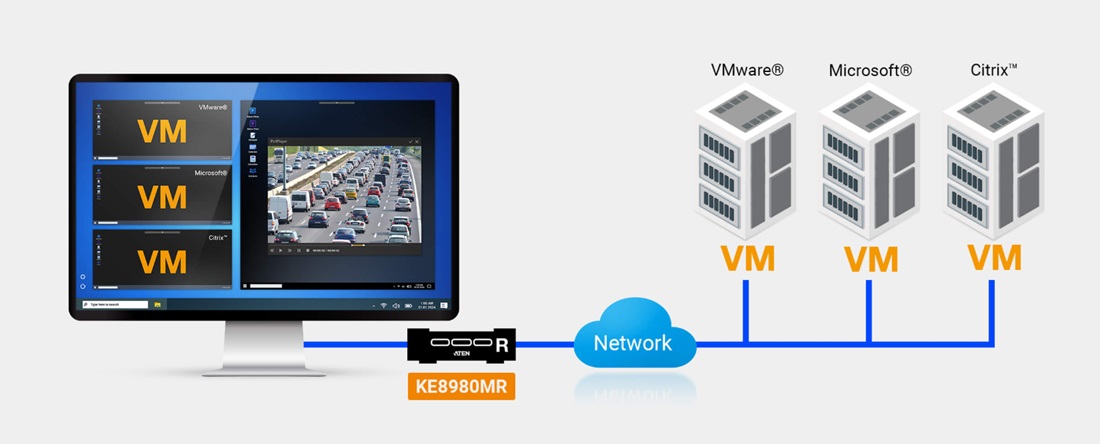 นอกจากจะรองรับระบบเซิร์ฟเวอร์จริงแล้ว KE8980MR ยังช่วยให้เข้าถึงและควบคุมสภาพแวดล้อมเสมือนบนแพลตฟอร์มต่างๆ เช่น VMware®, Microsoft® และ Citrix™ ได้ผ่านโปรโตคอล RDP (Remote Desktop Protocol) และ VNC (Virtual Network Computing)