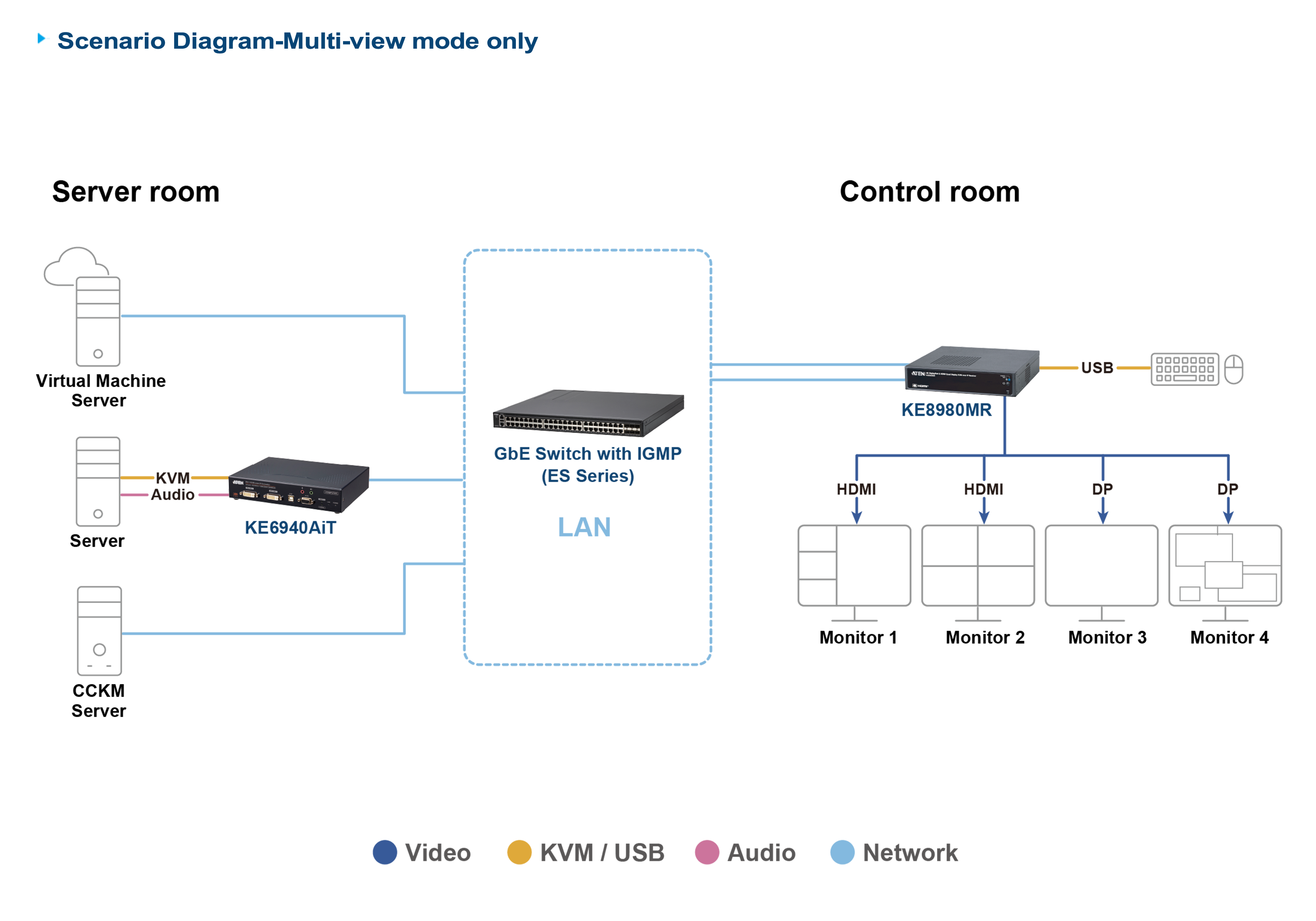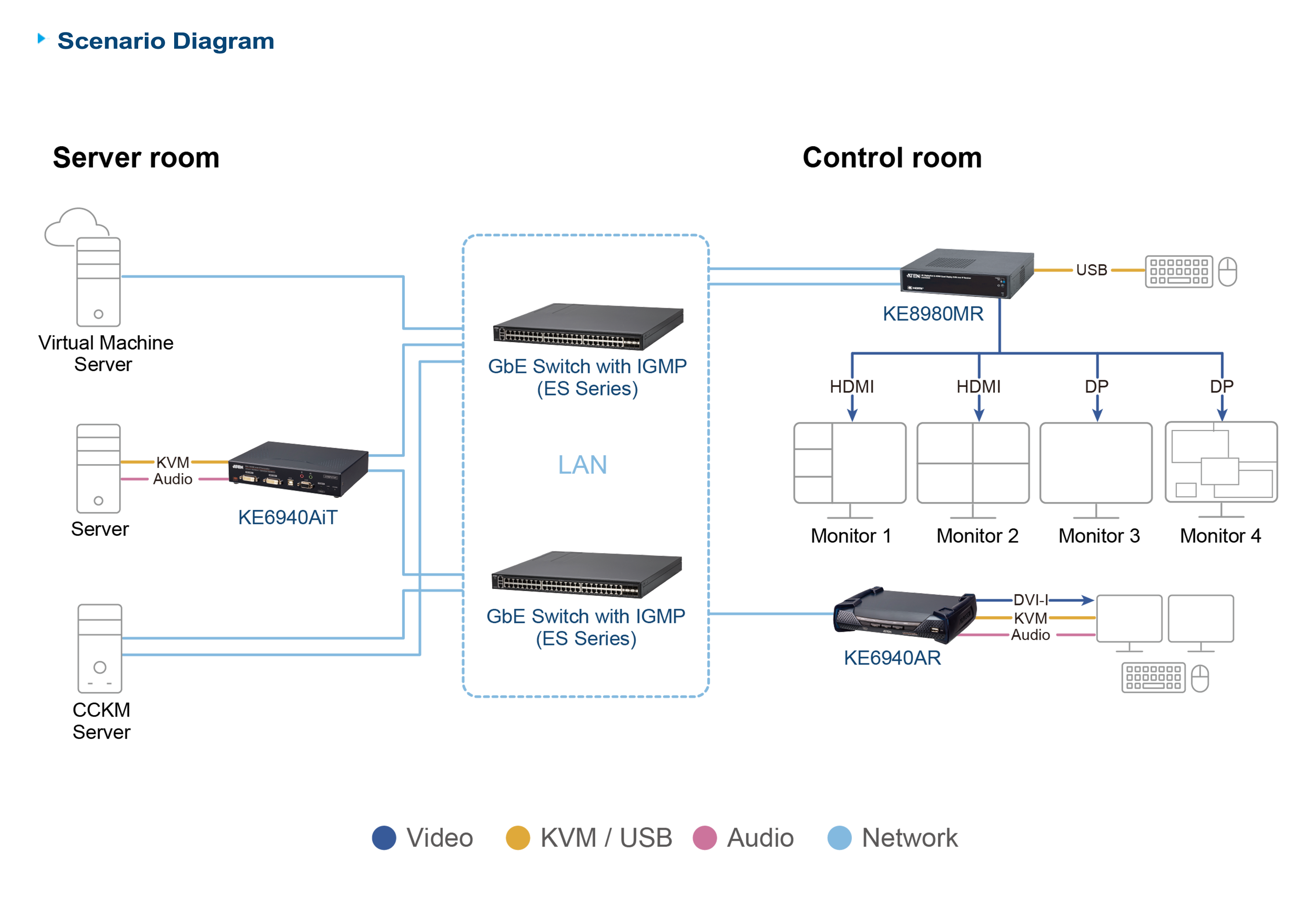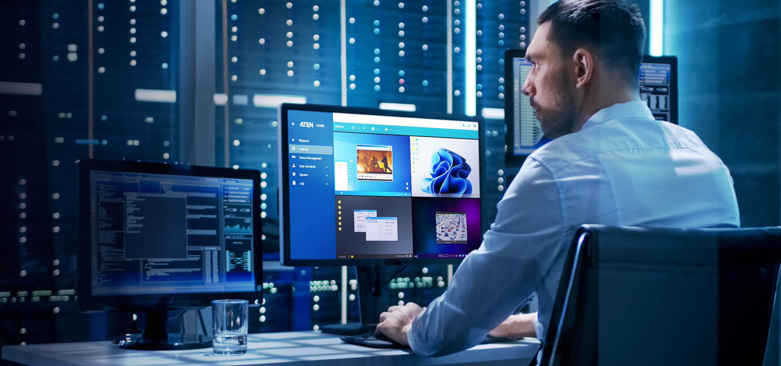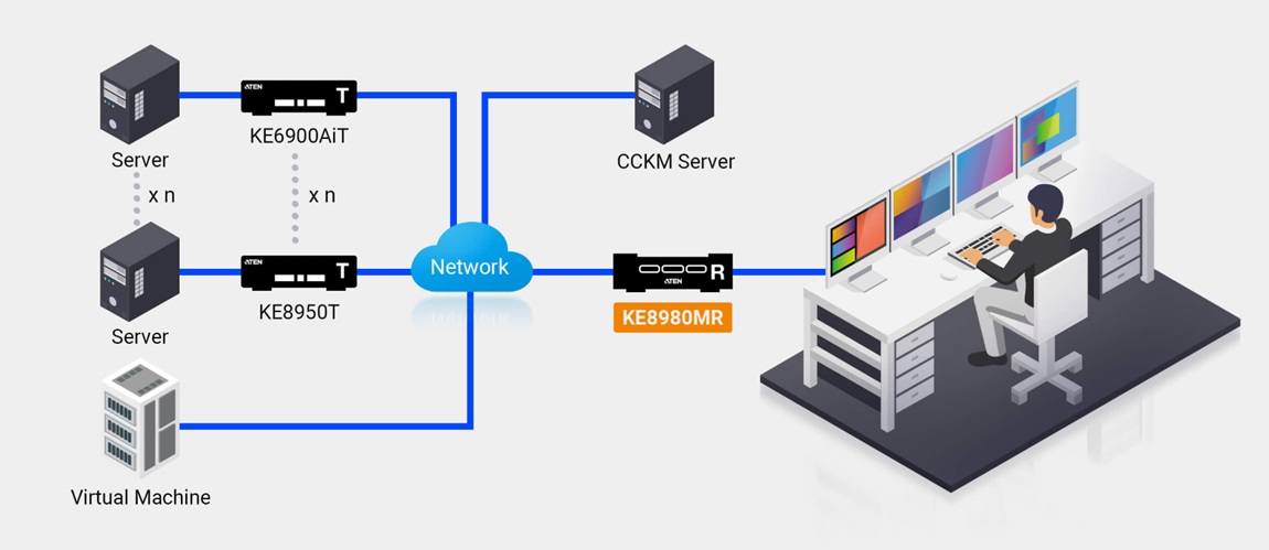 ในฐานะส่วนหนึ่งของระบบ KVM over IP Matrix ที่ปรับขนาดได้ อุปกรณ์นี้ช่วยให้ผู้ปฏิบัติงานสามารถตรวจสอบและสลับระหว่างเซิร์ฟเวอร์จริงที่เชื่อมต่อผ่านตัวส่งสัญญาณ KVM over IP (KE series) และเครื่องเสมือนได้อย่างราบรื่นแบบเรียลไทม์ โดยทั้งหมดนี้สามารถจัดการได้อย่างง่ายดายผ่านระบบ CCKM ที่ใช้งานง่ายของ ATEN