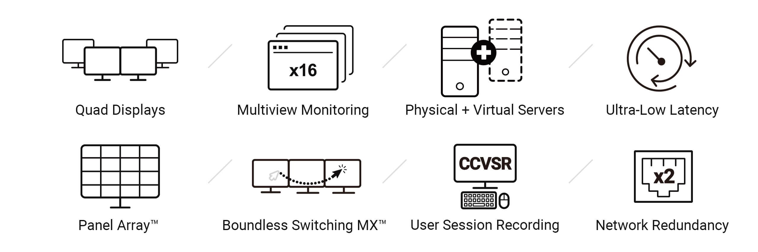 ในระหว่างการตรวจสอบระบบ คุณสามารถสลับการตั้งค่าหน้าจอทั้ง 4 จอเข้าสู่โหมดการทำงาน ซึ่งมีฟีเจอร์ Panel Array™ ที่จะเน้นแสดงวิดีโอของเซิร์ฟเวอร์เฉพาะตัวบนหน้าจอหนึ่งเพื่อให้ความสนใจเป็นพิเศษ ในขณะที่หน้าจออื่นๆ จะแสดงผลแบบหลายมุมมอง (multiview) ได้สูงสุดถึง 6x6 (รวม 108 เซิร์ฟเวอร์) ทำให้สามารถจัดการเซิร์ฟเวอร์จากส่วนกลางและมอบประสบการณ์การตรวจสอบที่ราบรื่นยิ่งขึ้น