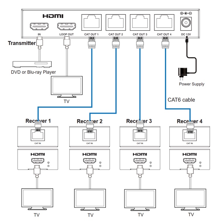 สามารถส่งสัญญาณได้ไกลถึง 70 เมตร สำหรับวิดีโอ 4K@30Hz และ 60 เมตร สำหรับวิดีโอ 4K@60Hz โดยใช้สาย CAT6 เพียงเส้นเดียว.