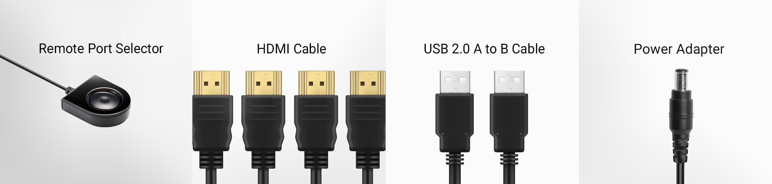 ทุกสิ่งที่จำเป็นรวมอยู่ในชุดแล้ว – ประกอบด้วย สาย HDMI 4 เส้น, สาย USB 2.0 A to B 2 เส้น, อะแดปเตอร์แปลงไฟ 1 ตัว, และ ตัวเลือกพอร์ตระยะไกล (ปุ่มสวิตช์แบบมีสาย) 1 ตัว – เพื่อให้สามารถติดตั้งใช้งานได้ทันที