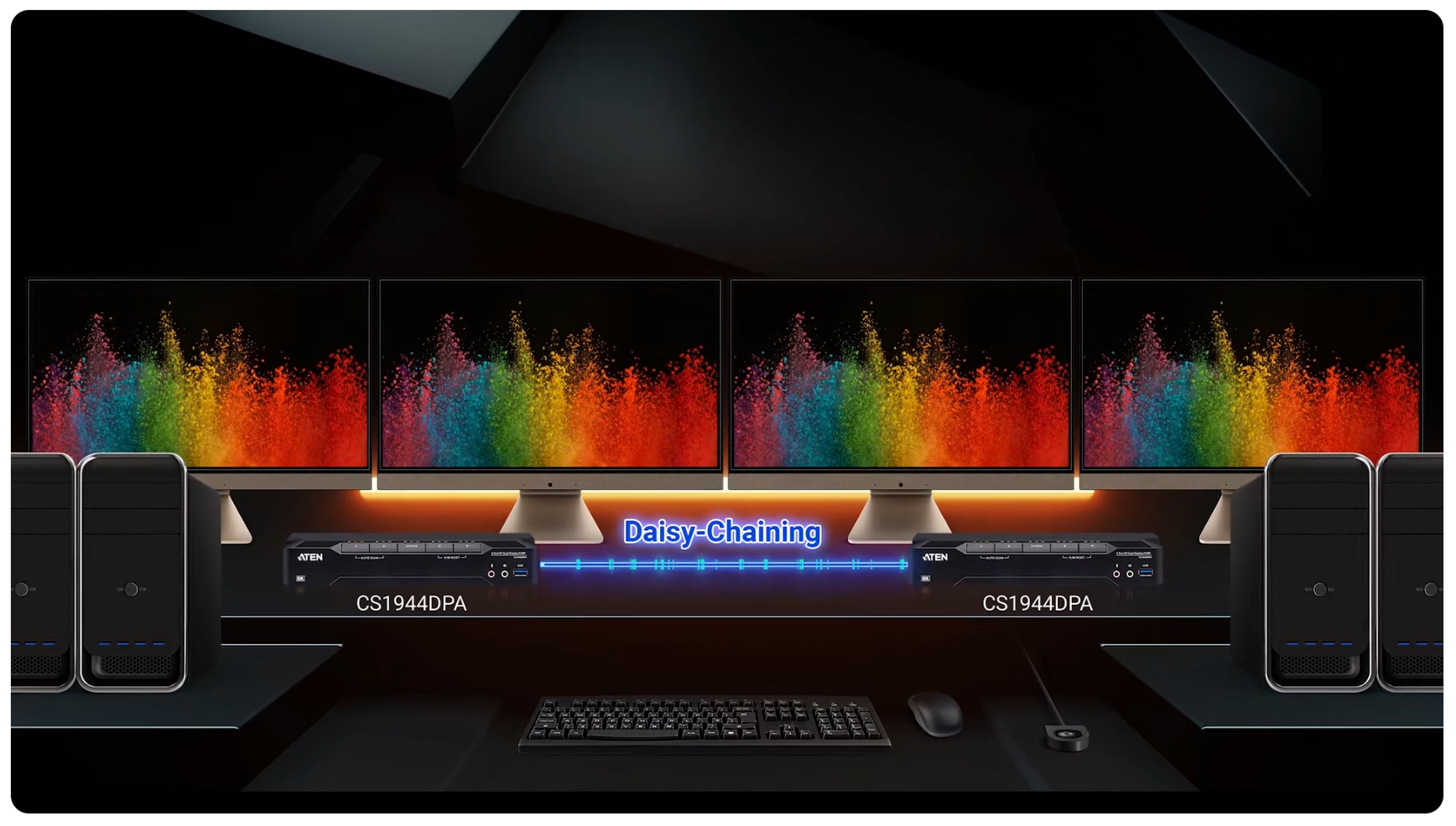 เปลี่ยนโต๊ะทำงานของคุณให้กลายเป็นขุมพลัง 4 หน้าจอ ด้วยการเชื่อมต่อสวิตช์ KVM รุ่น CS1944DPA สองเครื่องเข้าด้วยกันผ่านพอร์ต DCC (Daisy-Chain Control) โดยคอนโซล KVM ระบบมัลติซิสเต็มนี้ จะช่วยให้คุณสามารถควบคุมคอมพิวเตอร์ได้สูงสุดถึง 4 เครื่อง ผ่านหน้าจอแสดงผล 4 จอ โดยใช้คีย์บอร์ดและเมาส์เพียงชุดเดียวเท่านั้น ถือเป็นโซลูชันที่มีประโยชน์อย่างยิ่งในการปรับปรุงกระบวนการทำงานแบบไฮบริด (Hybrid Workflow) ที่การทำงานหลายอย่างพร้อมกัน (Multitasking) เป็นสิ่งสำคัญ