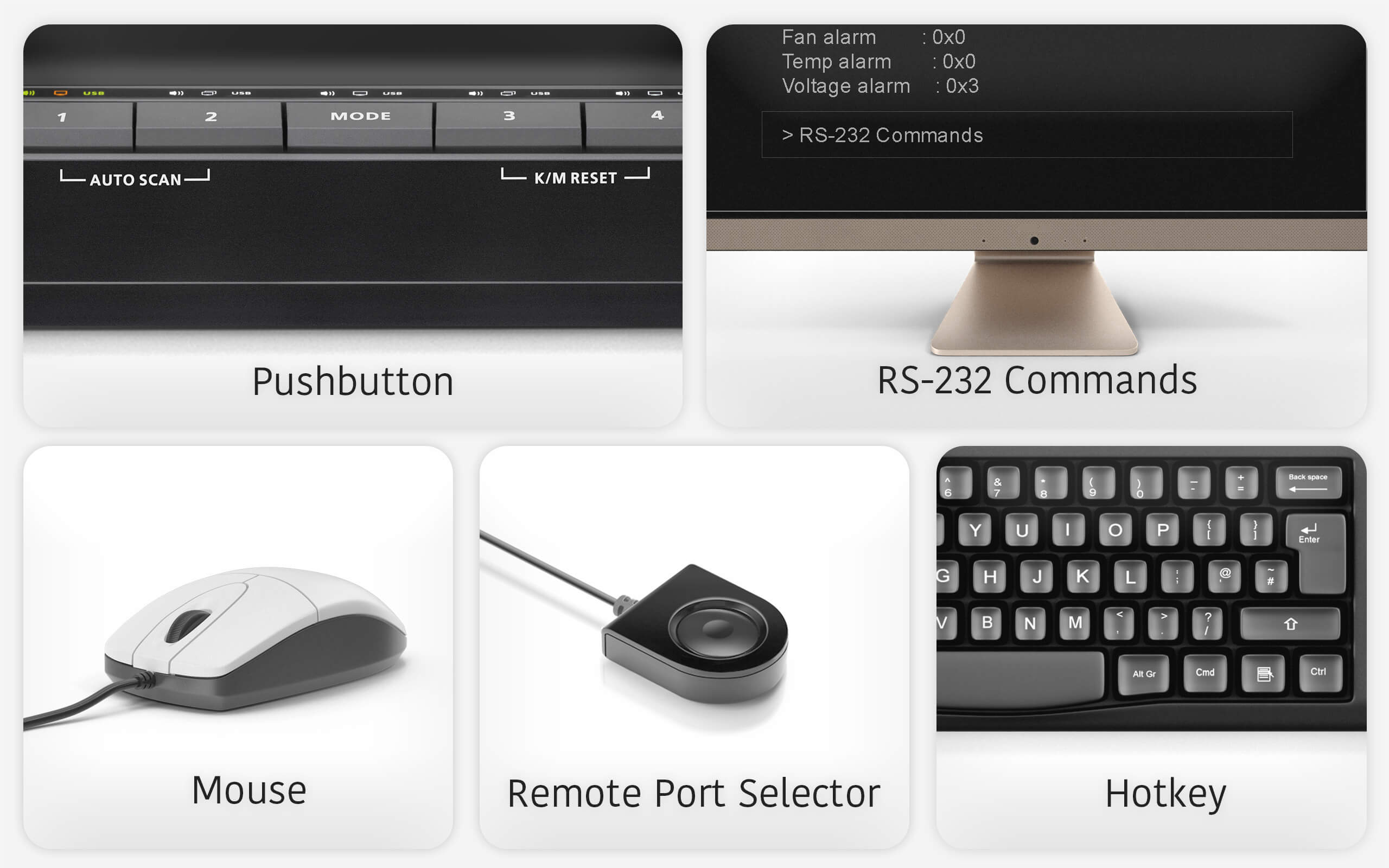 เลือกคอมพิวเตอร์ได้หลายวิธี: ผ่านปุ่มกดหน้าเครื่อง, รีโมทสลับพอร์ต, ฮอตคีย์บนคีย์บอร์ด, เมาส์⁴ หรือคำสั่ง RS-232