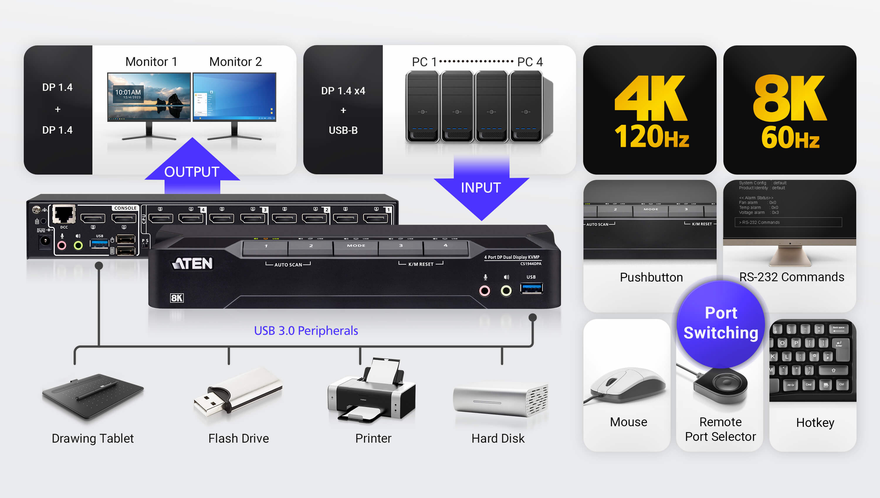| Port Selection | Hotkey, Pushbutton, Mouse wheel, RS-232 Commands, Remote port selector |