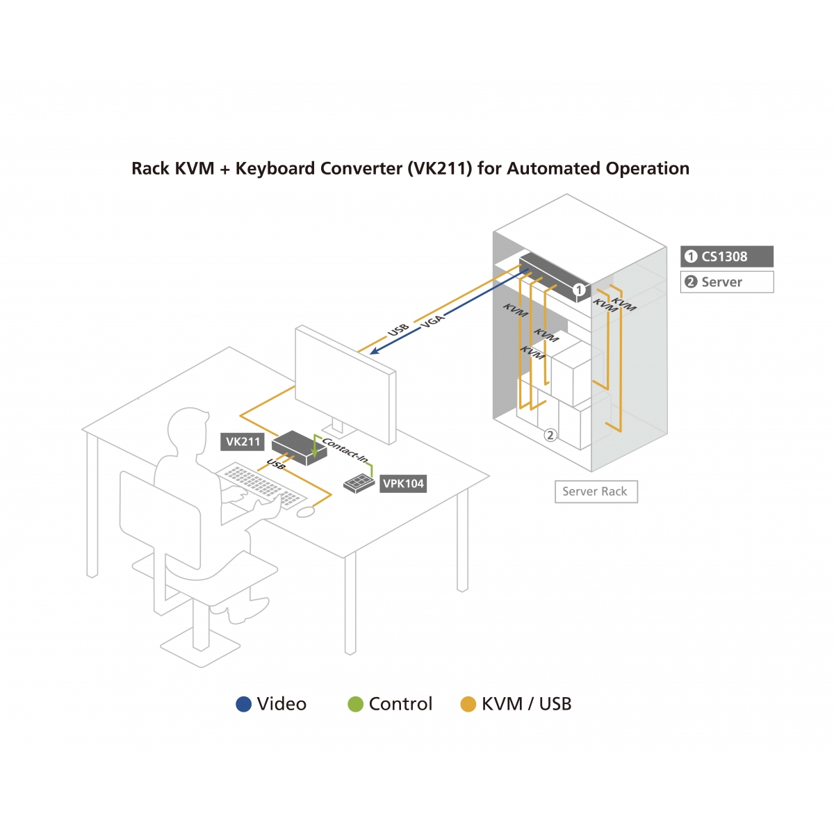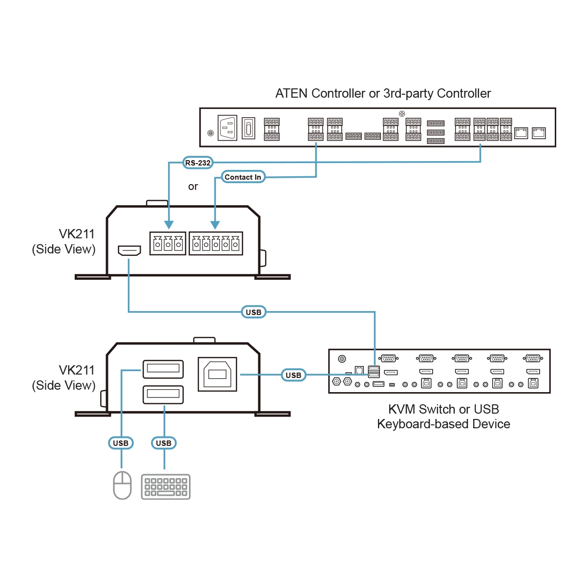 VK211 ช่วยให้คุณสามารถควบคุมอุปกรณ์ที่ใช้ PC-based หรือ KVM Switch ได้อย่างยืดหยุ่น ผ่านการกดปุ่ม Keypad, Touch panel, Tablets หรือ Controller โดยเชื่อมต่อผ่านพอร์ต Contact และ RS-232