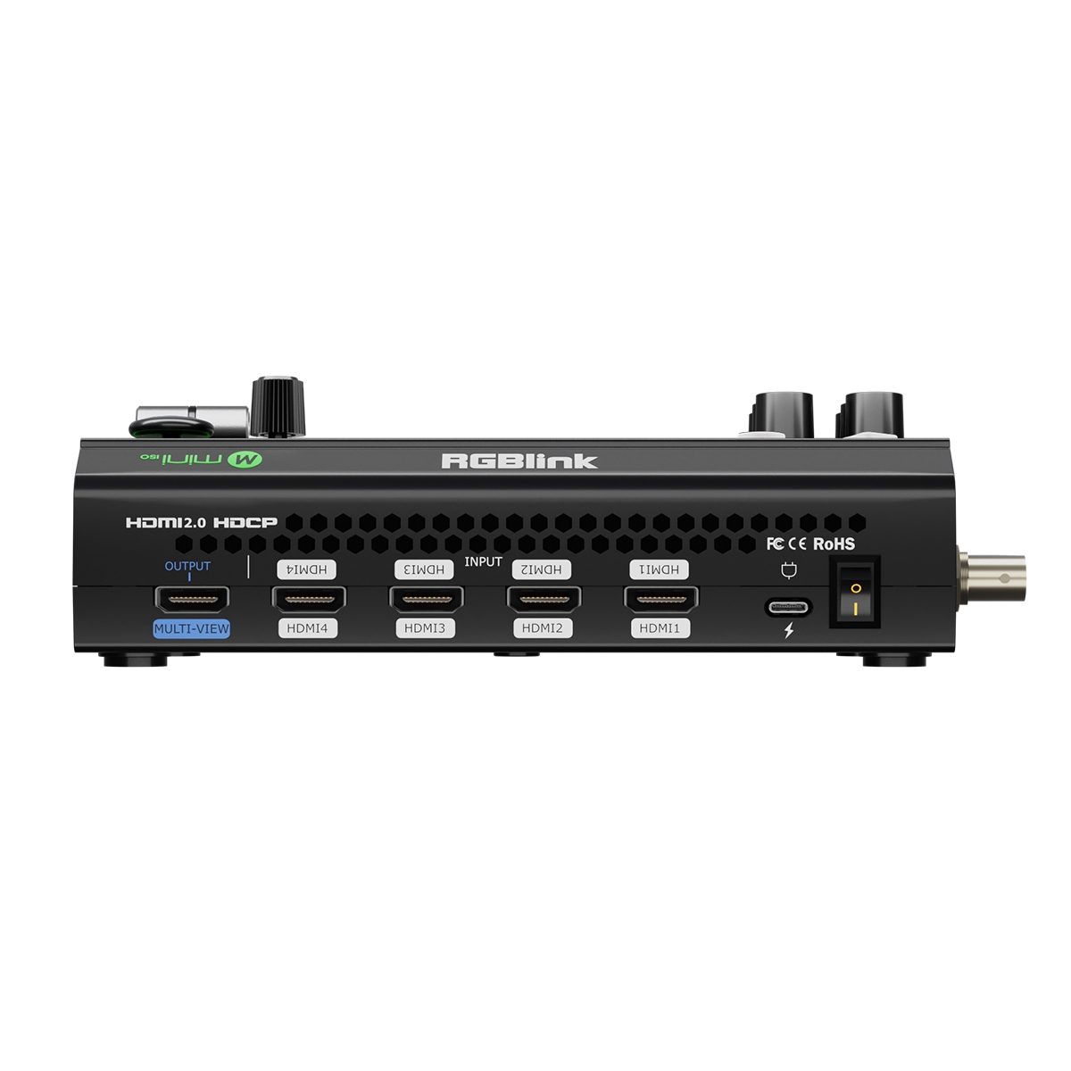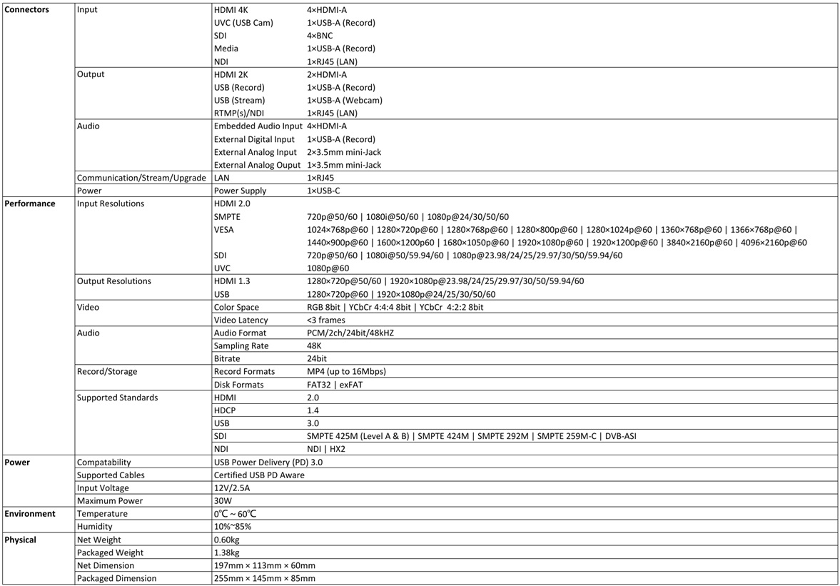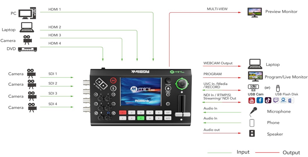 mini-ISO มีอินพุต 4K HDMI 4 ช่อง และอินพุต SDI 4 ช่อง รองรับสัญญาณจาก PC, แล็ปท็อป, กล้อง และอื่นๆ รองรับเสียงระดับ Line และ Mic บนบอร์ดพร้อมการควบคุมความหน่วงที่ปรับได้ เพื่อให้เสียงซิงค์กันหากจำเป็น เอาท์พุต HDMI คู่ รองรับการตรวจสอบการแสดงภาพ multi-view, PGM หรือ Test Pattern เอาท์พุต USB 1 ช่องรองรับรูปแบบการเข้ารหัส YUY2 และ MJPEG ซึ่งสามารถรับรู้ได้ว่าเป็นเว็บแคมสำหรับการสตรีมไปยัง Facebook, YouTube, ZOOM และอื่นๆ