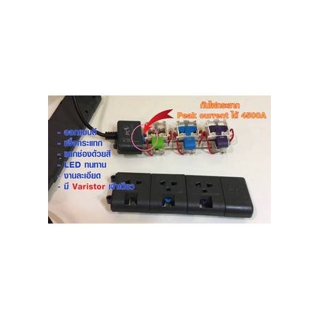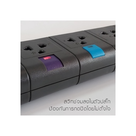 ปลั๊กไฟ ปลั๊กพ่วง ช่องสวิทซ์เปิด-ปิด แยกตามเต้าเสียบ หมดปัญหาเผลอปิดด้วยสวิทช์จม ได้รับมาตรฐาน มอก. 2432/2555 มีอุปกรณ์กันไฟกระชาก ด้วยอุปกรณ์ Varistor รับประกันตลอดอายุการใช้งาน