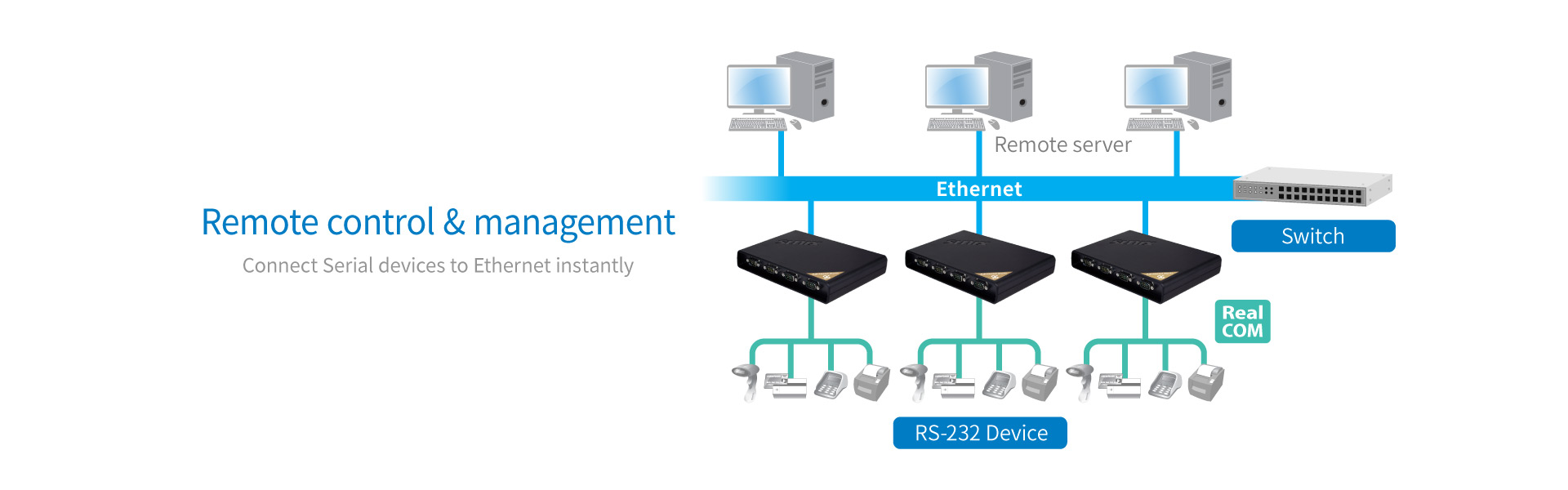 รองรับการใช้งานแบบ Serial over IP และสามารถสร้าง Virtual COM Port บน Windows ทำให้ระบบมองเห็นพอร์ตเหมือนต่อสายตรง แม้จะใช้งานผ่าน LAN ก็ตาม เหมาะสำหรับงาน Industrial Automation, ระบบควบคุมสายการผลิต และองค์กรที่ต้องการแชร์ COM Port ผ่าน Ethernet