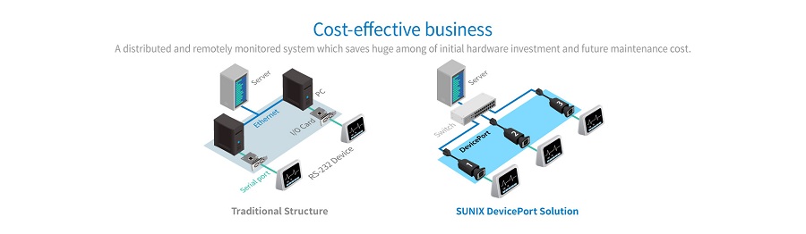 DPAS01DZ0 allows users to expand 1 RS-232 port over Ethernet connection, and it works on any windows based desktop, thin client, laptop, All-in-one, and tablet PC computers. With SUNIX DPL2000Q High-Performance Ethernet-UARTcontroller and exclusive I/O Redirection Technology, DevicePort creates physical COM ports that support real time data communication, Smart COM on/off-line deployment, and Ethernet-COM port hot-plug capability; user can expand RS-232 COM port easily without complex software configuration. SUNIX DevicePort improves solution deployment efficiency to achieve greater reliability in commercial and industrial automation applications.