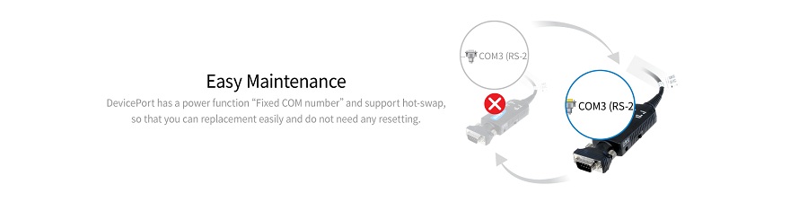 | 1.DevicePort Advance Mode limits specific Ethernet port connection, and it does not works on router operation. 2.DevicePort on/off-line smart COM deployment. - Auto connection and mapping with MAC address bound. - Keeps physical COM port in system when DevicePort under off-line mode. - Serial signal staging until DevicePort recovery back to on-line mode. |