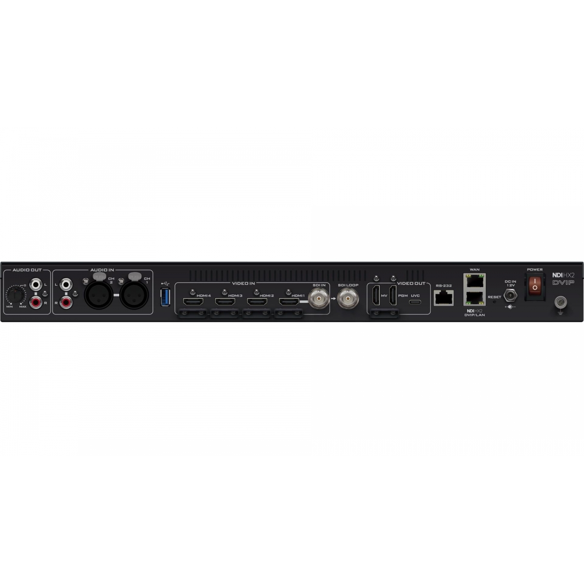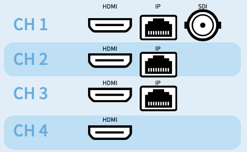 1x 3G/HD/SD-SDI (BNC75ohm) 4x HDMI1.4 (Channel 1 as SDI/HDMI selectable) 3x RTSP/ SRT/ NDI|HX via IP Stream |