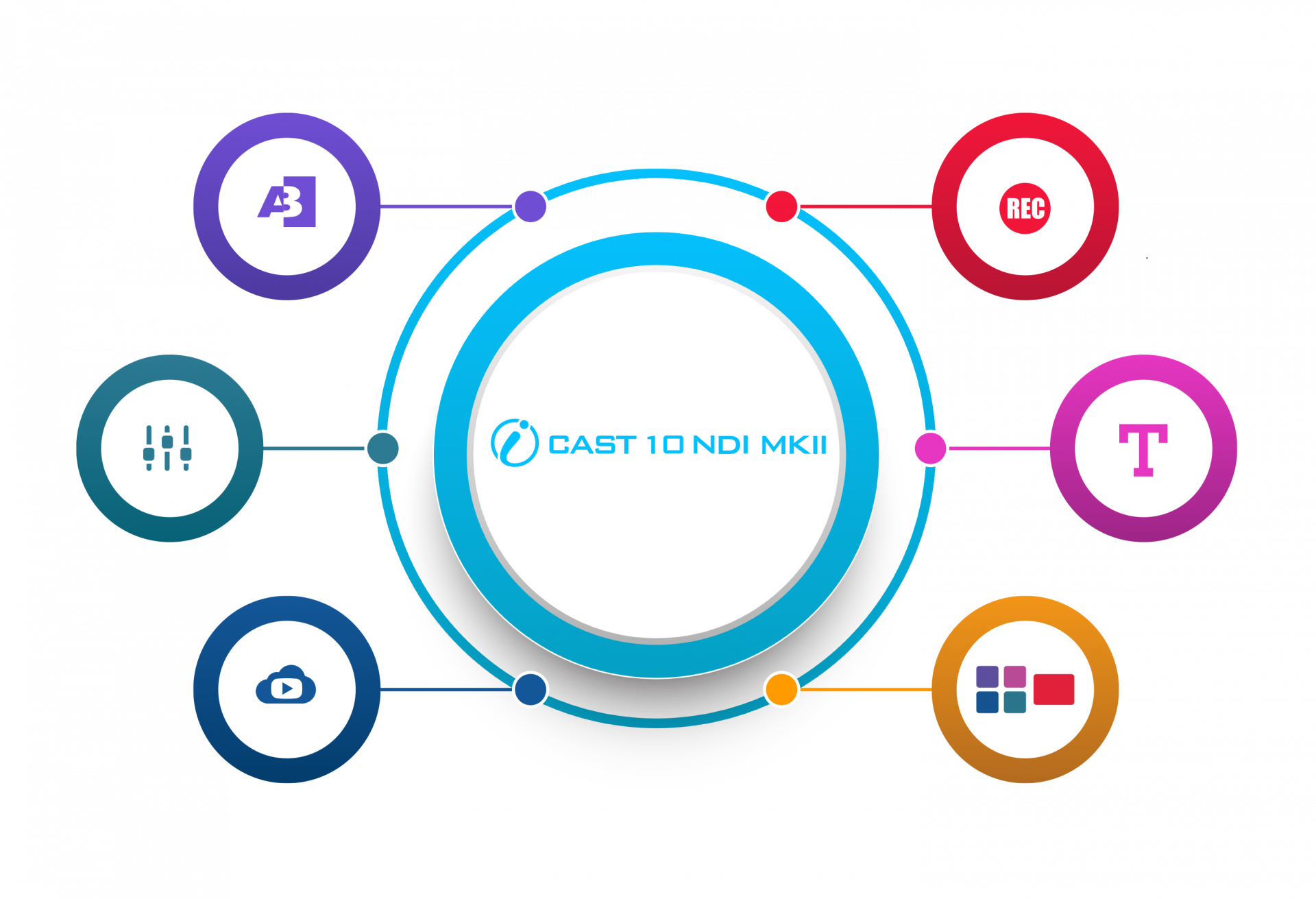 iCAST 10NDI MKII คือโซลูชันสำหรับการผลิตรายการสดที่ล้ำสมัย โดยรวมเอา สวิตช์เชอร์ (Switcher), ตัวควบคุมกล้อง (Camera Controller) และ ตัวเข้ารหัสสตรีมมิ่ง (Streaming Encoder) เข้าไว้ในอุปกรณ์ขนาดกะทัดรัดเพียงเครื่องเดียว คุณสามารถเชื่อมต่อสัญญาณขาเข้าได้หลากหลาย เช่น กล้อง PTZ และแล็ปท็อปสำหรับสไลด์นำเสนอ เพื่อสร้างสรรค์งานนำเสนอที่น่าดึงดูดได้อย่างง่ายดาย